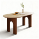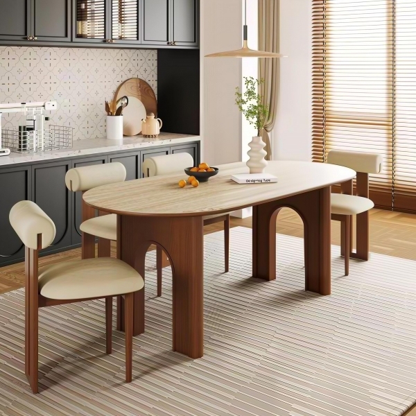 洞石岩板+全托底板+多层实木贴皮结合白蜡木边框桌腿