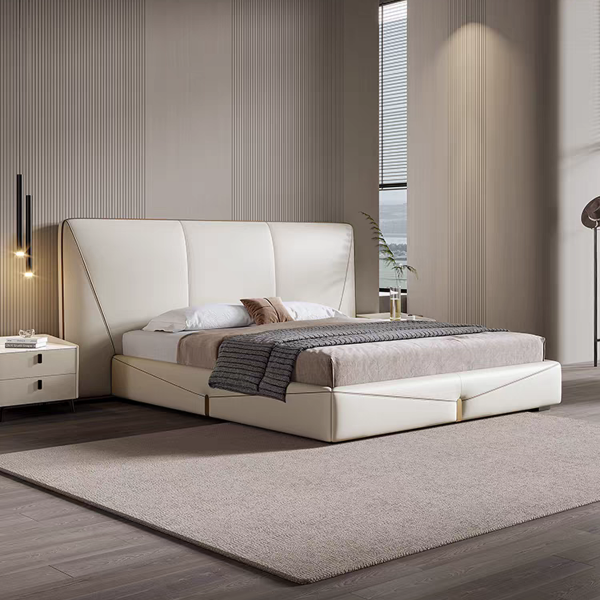 接触面头层真皮+高密度海绵+实木内框+镀金五金饰件+15公分钢木排骨架+五金脚