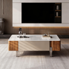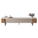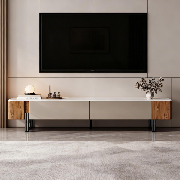 雅典玉白微晶石台面+E1级板材贴贴科技木膜柜体+抽屉环板板贴皮+不锈钢脚