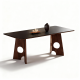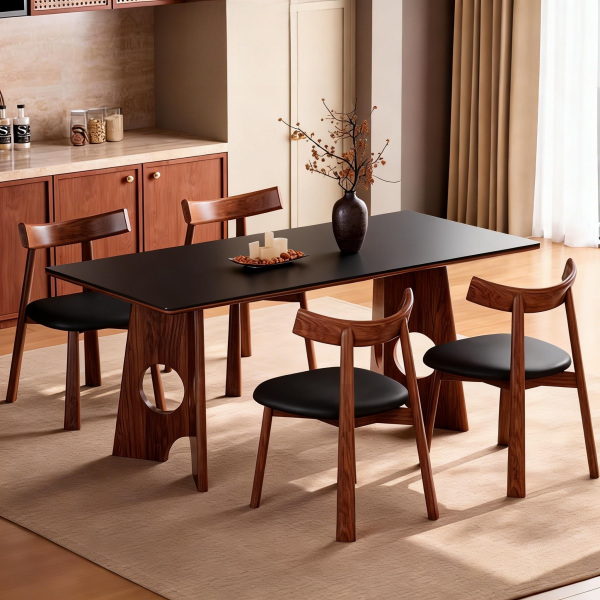 纯黑岩板桌面+全托底板固定+实木脚架
