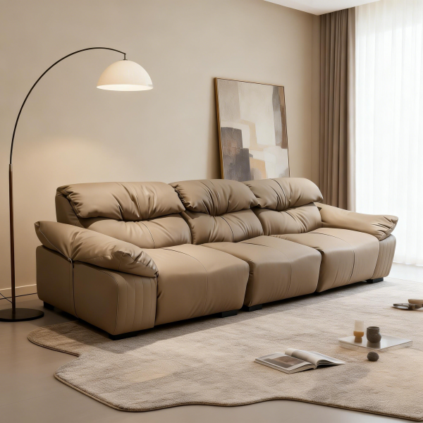 接触面头层真皮+高密度回弹海绵+扶手羽绒填充+实木内框+5公分实木脚