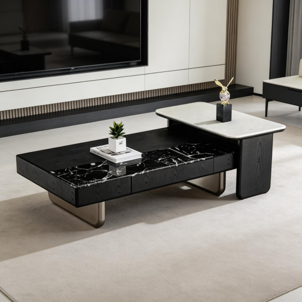 茶几:纳秋绿奢石面+E1级板贴烟熏木皮/边几:大理石面+E1级板贴烟熏木皮