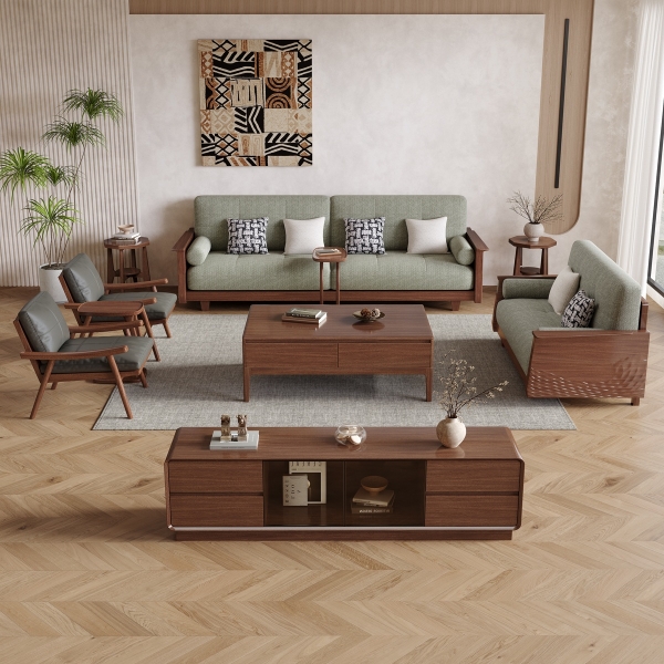 棉麻布面料+进口胡桃木架+实木多层板辅材+高密度海绵